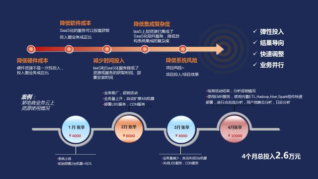 1.弹性资源:从一次性资源预算,投入以峰值评估,到资源投入随业务量自动扩展,闲置时自动降低成本。