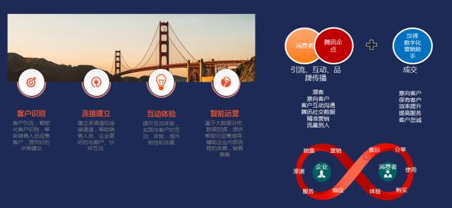 汉得零售云:解决企业门店、渠道与消费者连接,实现消费者数据沉淀、互动体验与精准营销。连接带来成交,数据创造收入。依托腾讯社交能力,建立消费者有效连接。汉得营销助手依托腾讯社交大数据,促进转换,提升效率。