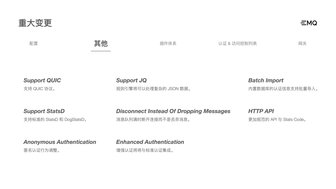EMQ X Broker 5.0 将为 MQTT 设备支持 QUIC 协议以提高接入效率和弱网传输效率,并提供 Erlang 实现的支持 QUIC 的 MQTT 客户端库。同时,5.0 版本还将支持 JQ 增强规则引擎对复杂 JSON 数据的处理能力,例如提取 JSON 数组中的指定字段等。