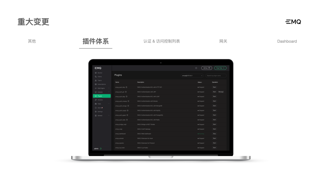 此外,EMQ X Broker 5.0 还将对插件体系进行全面调整,所有官方功能都不会再以插件形式提供,而是拥有各自的功能路径和页面,聚合相近的功能并提供相近的设计,改进使用体验。当然,插件机制将得到保留,以继续满足开发者开发自定义插件的需要。