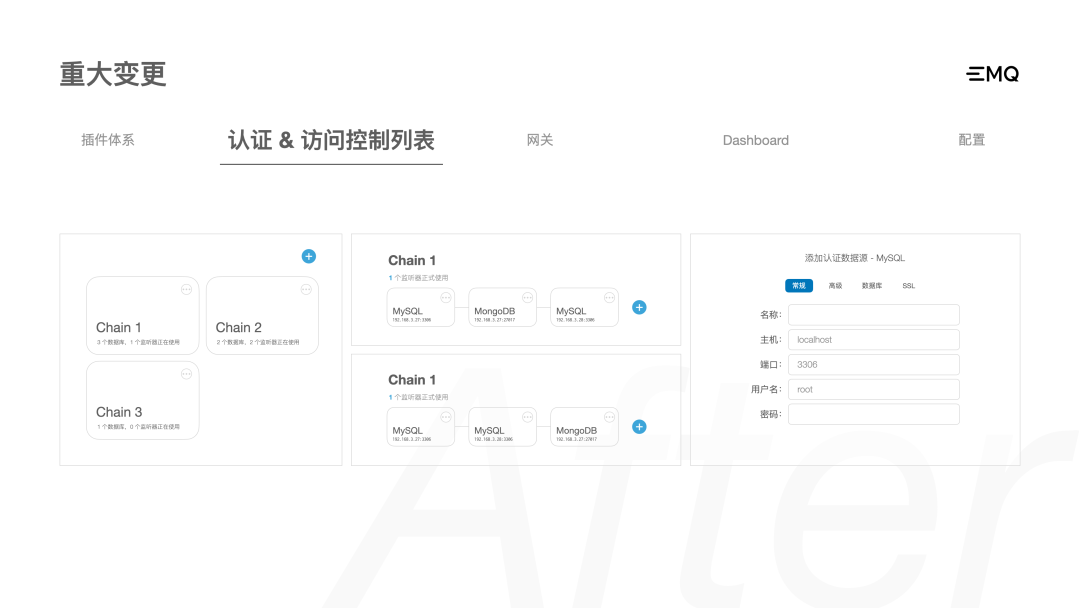 认证与访问控制列表功能也将在 EMQ X Broker 5.0 中得到全面的革新,解决难以调整认证顺序,所有客户端都必须走同一认证链等问题。