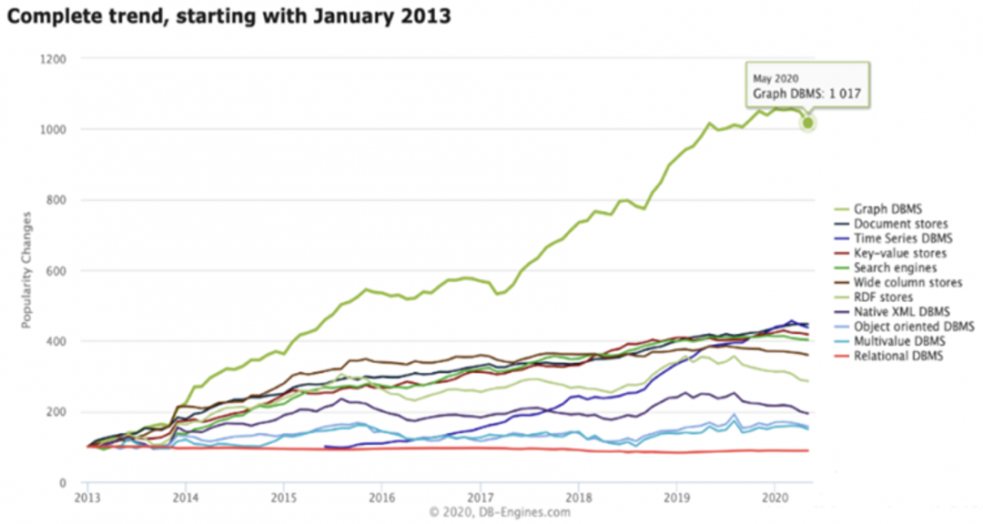 据DB-Engines的数据显示,近十年来,图数据库的关注度增速远超其他类型的数据库。Gartner预测2020年以后,全球图处理及图数据库的应用市场都将以每年100%的速度迅猛增长。