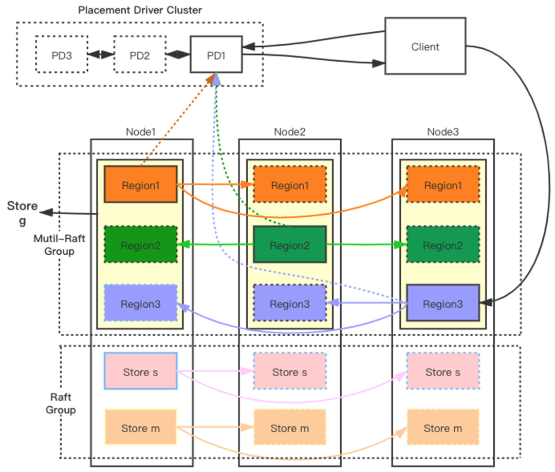 使用PD(Placement Driver,PD服务需要单独部署,主要负责整个集群的管理调度,Region ID生成等)集群来记录各Store中的region信息和状态,客户端访问时,通过PD获取region信息,然后向对应region的leader发起请求。