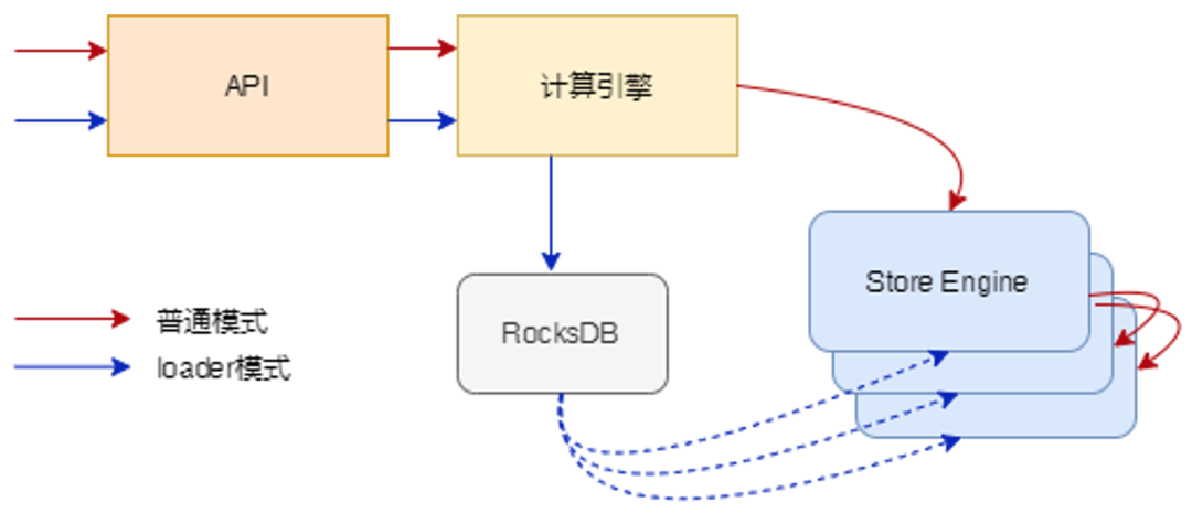 此外,为了提升分布式图数据库的数据加载性能,CirroData-Graph新增了Loader模式。在分布式系统中,需要保证数据的一致性,数据加载是一个主要的性能瓶颈。在普通模式下,数据经由API、计算引擎加载到一个节点的存储引擎中,再通过JRaft同步到其它两个节点中,效率低,加载慢。引入Loader模式后,数据经由API、计算引擎先落地到RocksDB中,再将RocksDB的sst文件以异步任务的方式通过JRaft同步到所有节点,这样在保证了数据一致性的前提下,也让加载性能有质的提高。