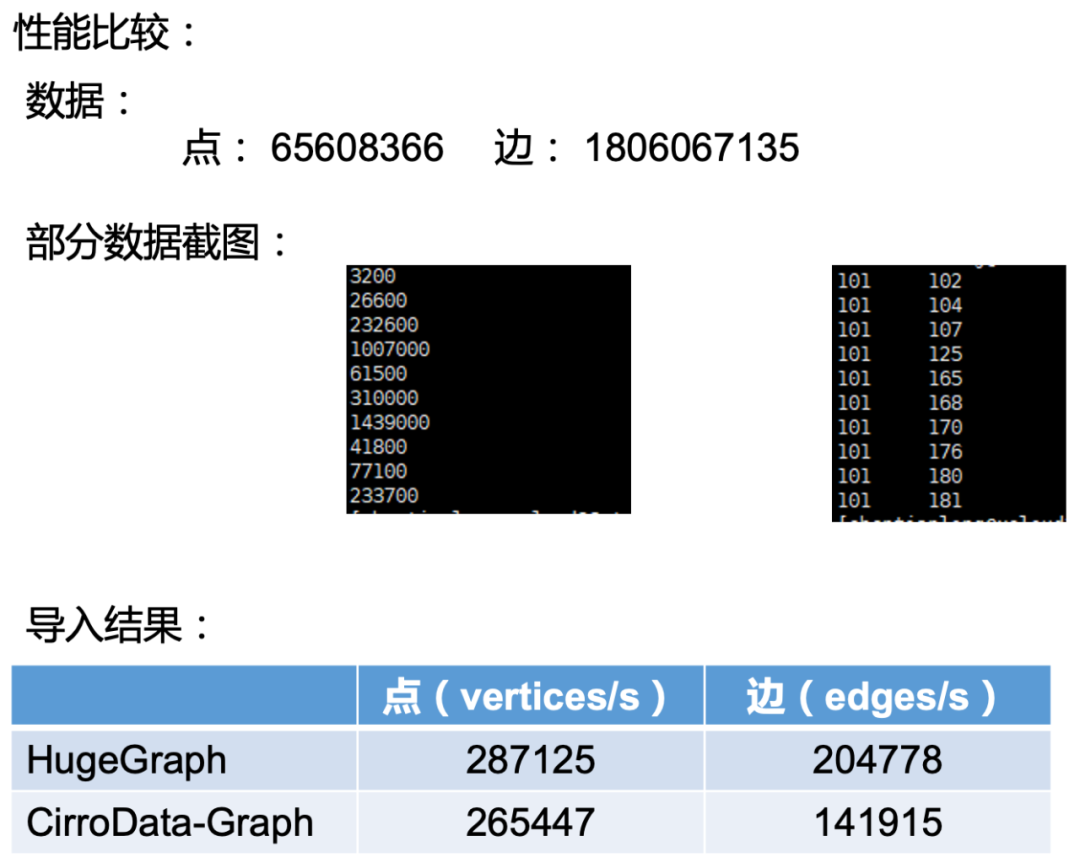 从上图可以看出,在Loader模式下的数据加载性能可达单机版HugeGraph性能的70%左右,对于分布式系统来说这是一个非常不错的数字。之后我们还会继续完善Loader模式,达到在加载性能方面与HugeGraph持平的标准,此外通过扩大集群规模也可能使CirroData-Graph超越HugeGraph的加载性能。