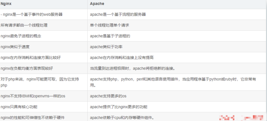 Apache: 创建多个进程或线程,而每个进程或线程都会为其分配 cpu 和内存(线程要比进程小的多,所以 worker 支持比 perfork 高的并发),并发过大会榨干服务器资源。