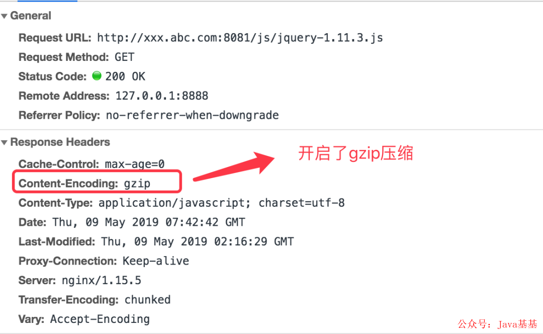 并且我们查看响应头会看到gzip这样的压缩,如下所示