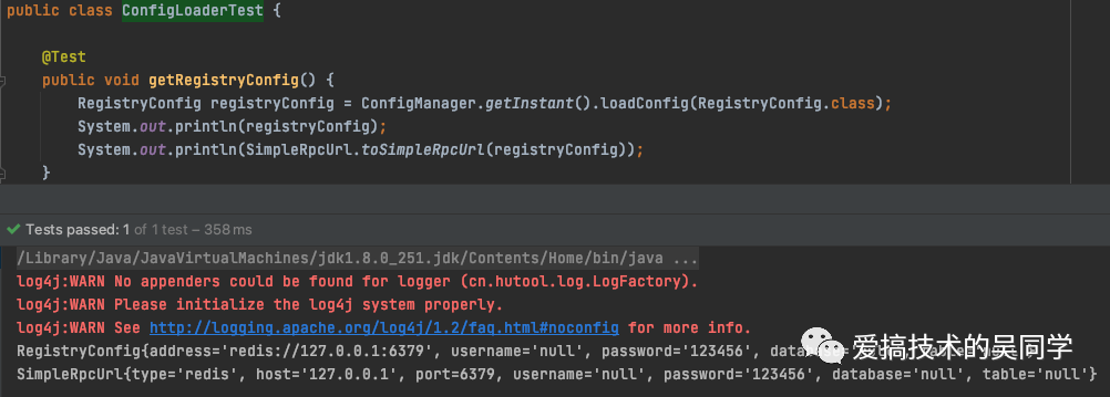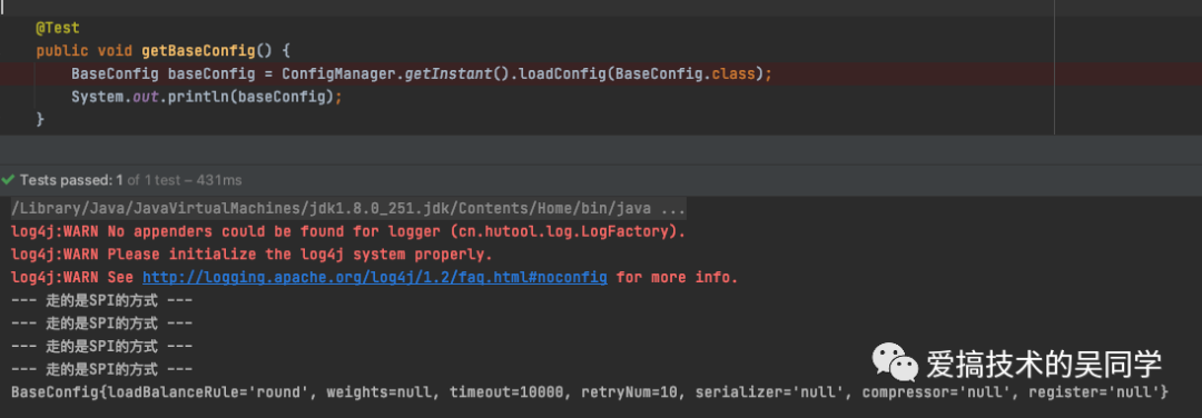 @Testpublic void testSerialize() {System.out.println(ExtensionLoader.getLoader(Serializer.class).getExtension("json"));System.out.println(ExtensionLoader.getLoader(RegisterCenter.class).getExtension("mysql"));System.out.println(ExtensionLoader.getLoader(ConfigLoader.class).getExtension("spi-property"));}
