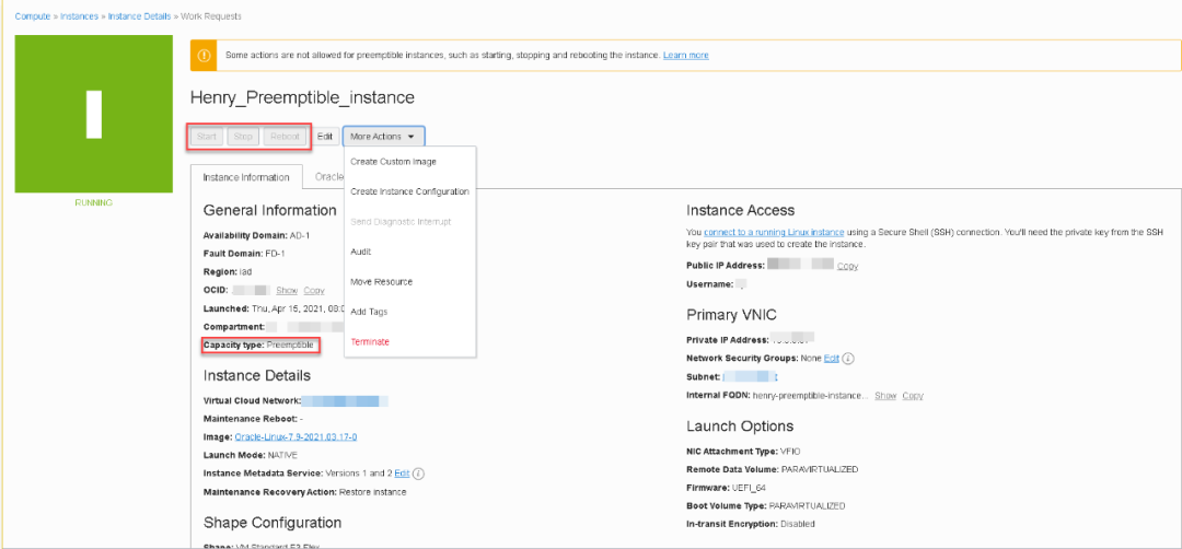 Oracle公有云为了向我们的客户提供足量的计算及相关资源,在我们的数据中心当中留有大量的空闲资源满足客户随时创建实例的需求,而不像某些友商,对比较流行的资源需要提前4小时进行申请。同时,为了满足临时需要大量计算资源或者大数据运算等操作较多的用户的降低成本的诉求,Oracle将公有云中的空闲资源以极低的价格提供给这些需要临时虚机资源的客户。出于公平原则,这些低价提供给客户的资源,Oracle将在需要时进行回收。比如当前该计算中心需要为其他客户提供常规的计算资源,而该中心空余资源临时紧张时,将会回收Preemptible实例所占用的资源。