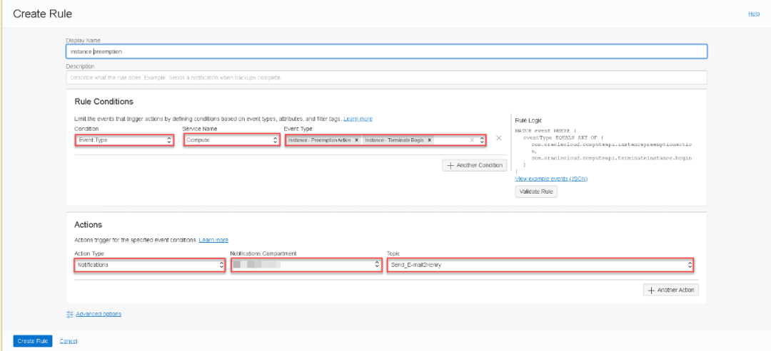 当Preemptible实例被回收时,实例将被终止。在实例终止开始前30秒,触发一个instance-preemption-action事件。所以我们可以按下图进行设定,为了给大家演示效果,我在Event Type当中加入了instance-Terminate begin,一会儿我们将该实例删除,看看是否可以收到邮件。如果可以收到,那么该实例被系统回收的时候,会触发instance-preemption-action事件,我们也会收到邮件。