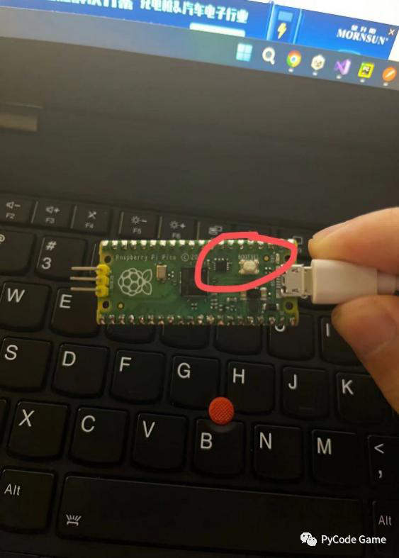 1、首先我们准备一根数据线(一定是数据线,部分可能是充电线),笔记本,和raspberry pico。数据线接入usb接口上,然后按压住树莓派复位键,再将树莓派pico与数据线进行连接。