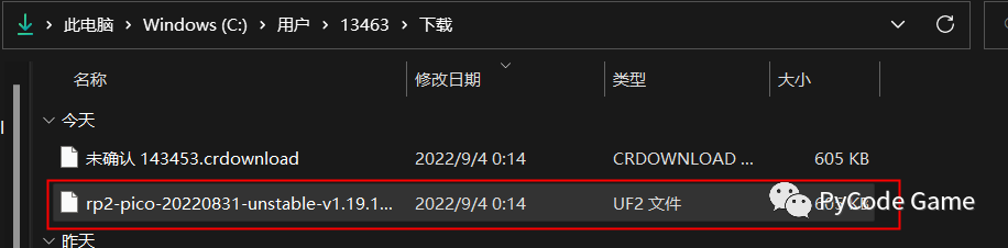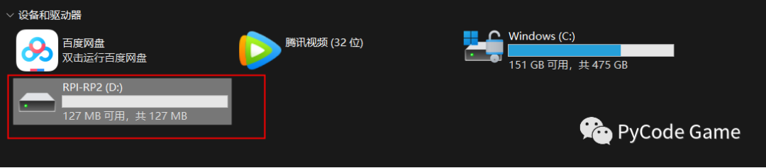 5、将下载好的文件拖入刚才的硬盘中,即可完成micropython 解释器的烧入。烧入成功后树莓派pico 会自动断开连接,此时将树莓派pico断开,重新接入即可使用。