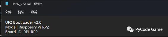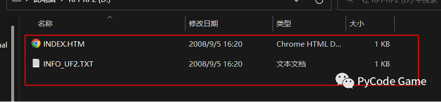 3、进入该硬盘,可以看到有两个文件,第一个文件是跳转到raspberry pi pico官网的网页文件,第二个是关于raspberry pi pico的相关信息(如下图):