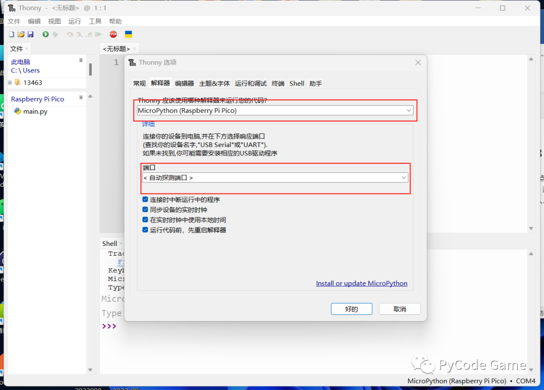1、点击菜单栏工具——选项,找到Thonny选项页面,现在MucroPython 解释器来运行代码,端口选择 自动探测端口,如果您的树莓派pico 已经连接到电脑,thonny会自动识别接入。如下图: