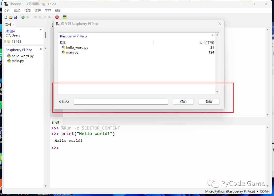 选择raspberry pi Pico,输入保存文件的名称,hello_world.py 点击保存
