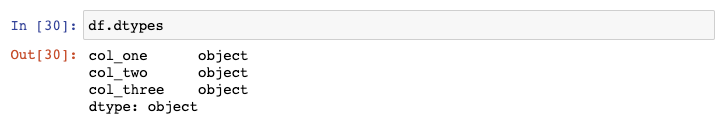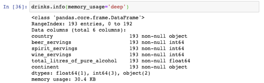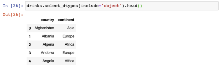 In [24]:drinks.dtypesOut[24]:country objectbeer_servings int64spirit_servings int64wine_servings int64total_litres_of_pure_alcohol float64continent objectdtype: object