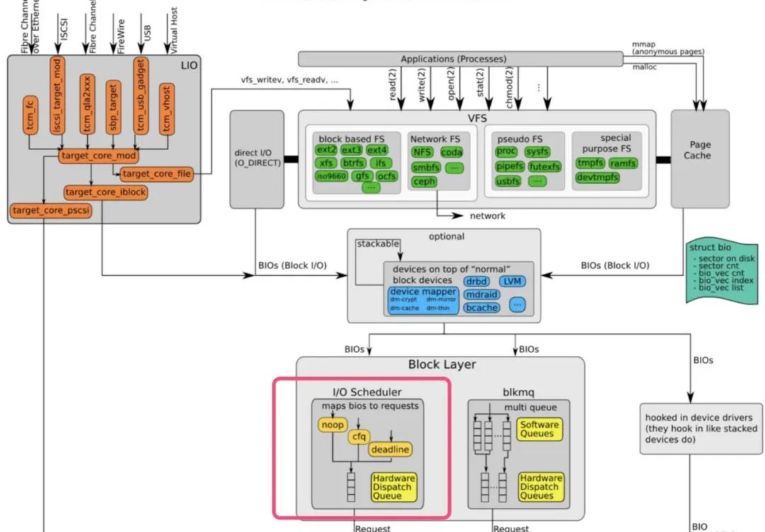 IO调度器(IO Scheduler)是操作系统用来决定块设备上IO操作提交顺序的方法。存在的目的有两个,一是提高IO吞吐量,二是降低IO响应时间。