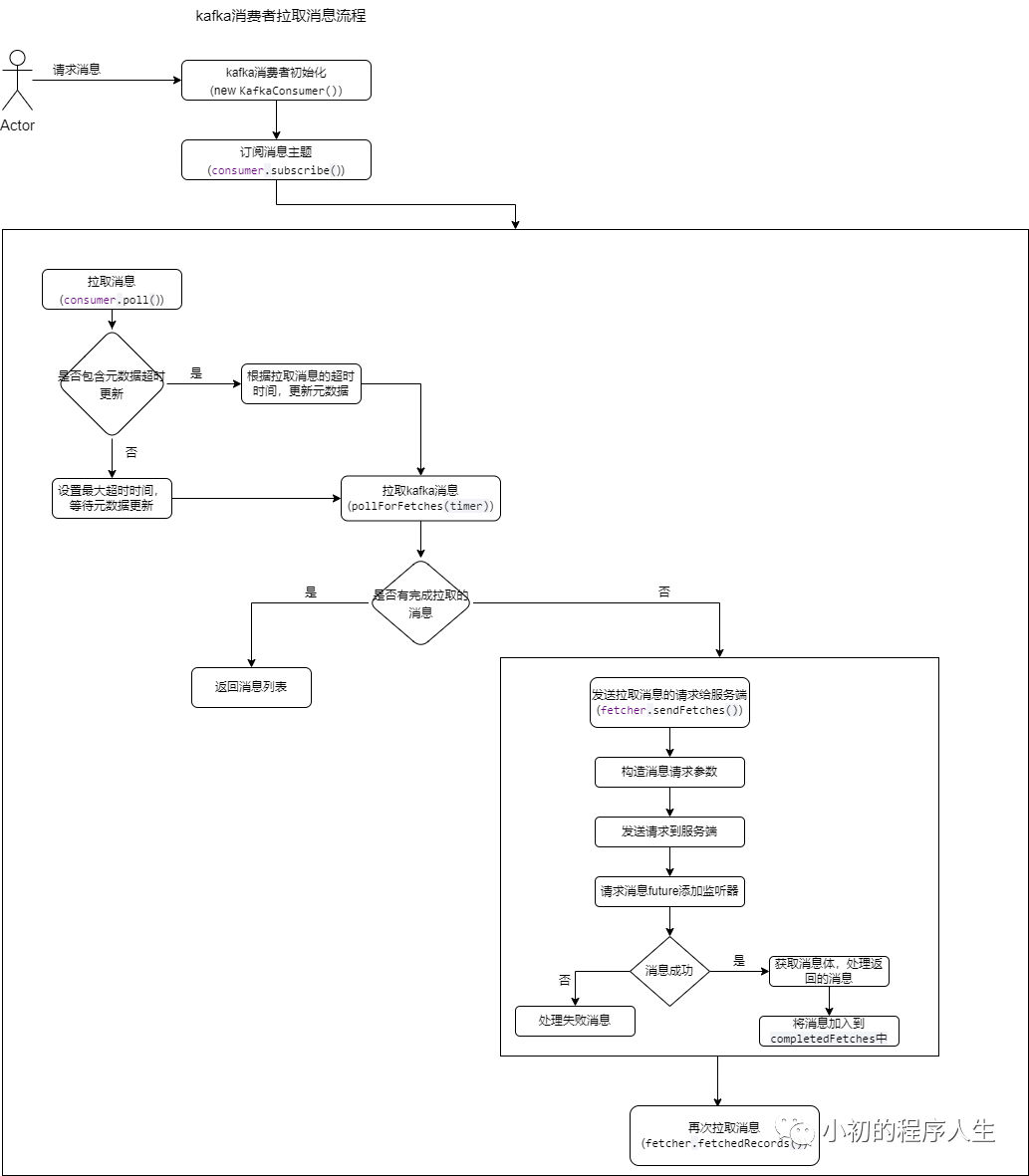 1.更新元数据,主要更新消息订阅的一些详细信息,并且对于消费者组的一些处理,kafka的消息处理是按照消费者组的维度进行处理的,所以,更新元数据,也包括了消费者组的初始化,消费者组的加入,以及选举消费者组的协调者等流程,这里的选举,很简单,只是将第一个加入到消费者组的消费者作为这个组的协调者,后面消费者组内部消费者消费哪些分区的消息,都是由协调者与borker进行交互,最终把消费者的消费分区分发给各个消费者,再由消费者统一去消费kafka的消息列表。
