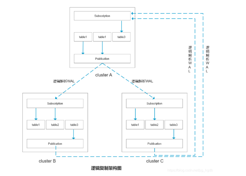 逻辑复制是基于WAL日志的逻辑解析,我们可以将WAL日志理解为ORACLE的redo日志。逻辑复制的原理是发布端的主库将Publication中表的WAL日志解析成一定格式并发送给备库的Subscription,Subscription接收到解析后的WAL日志后进行重放应用,从而实现表数据的同步。