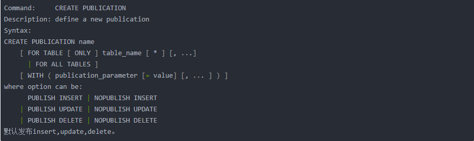 ③在同一个数据库中,可以创建多个publication,但是不能重名,通过系统表查看已创建的publication