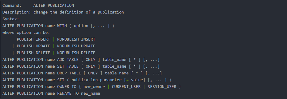 ⑥目前publication仅支持insert, update, delete。允许发布时,选择发布insert、update、delete,比如只发布insert,而不发布update, delete。当发布了表的update, delete时,表必须设置replica identity,即如何标示OLD TUPLE,通过pk或者uk或者full。如果设置了nothing,则执行update,delete时会报错。