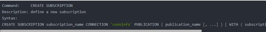 举例:create subscription sub1 connection ‘host=192.168.230.81 port=5866 dbname=postgres user=logicalrep password=logicalrep’ publication pub1;