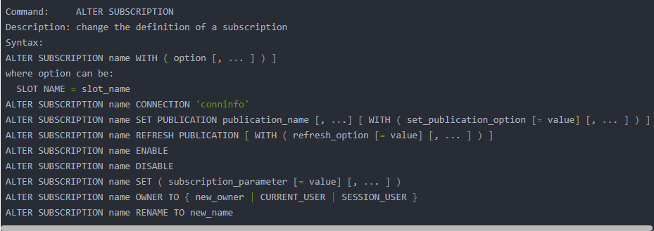 ⑥在创建subscription或者alter subscription时,可以使用enable来启用该订阅,或者使用disable暂停该订阅。