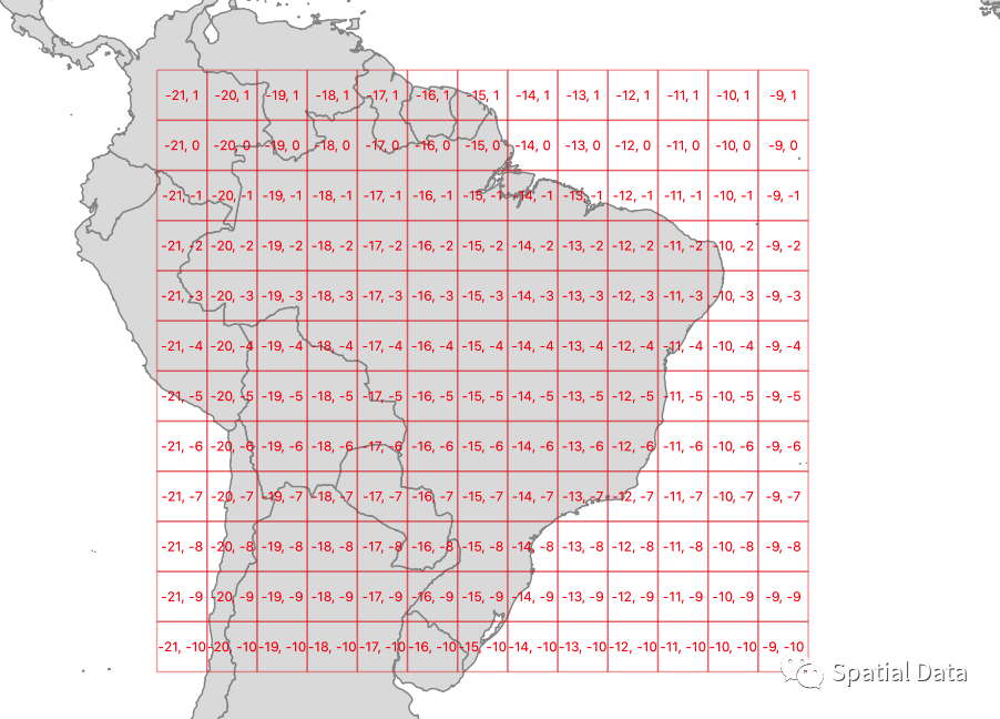 该示例获取巴西的国界,并转平面墨卡托坐标,以0 0为边界,以巴西国界的bbox为生成网格地理边界,生成一些列网格,结果如下: