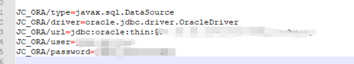 JC_ORA/type=javax.sql.DataSourceJC_ORA/driver=oracle.jdbc.driver.OracleDriverJC_ORA/url=jdbc:oracle:thin:@127.0.0.1:1521/testJC_ORA/user=testJC_ORA/password=test