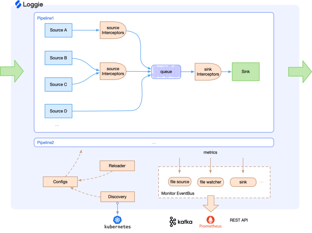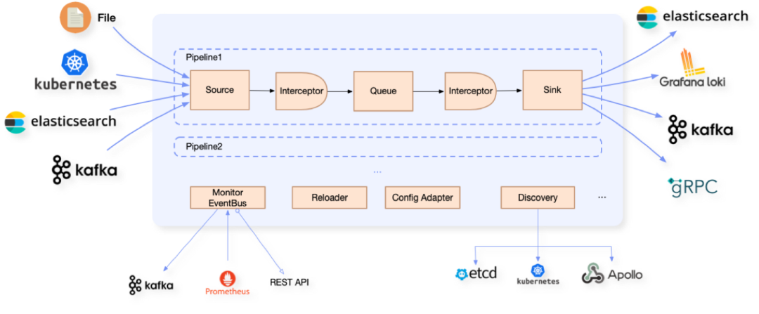 强隔离:多管道设计,减少互相干扰,可同时发送多个不同数据源,也可实现管道级别的Reload。 轻量级、高性能:基于Golang,并充分发挥了Golang的性能优势,实现了极少的资源占用与强大的吞吐性能,我们与同样基于Golang的Filebeat进行了压测性能对比,CPU消耗仅为Filebeat的1/4,发送吞吐量为Filebeat的1.6~2.6倍。 灵活的可插拔和可扩展能力:使用了微内核、组件化的架构,可以通过配置不同的Source(输入端)、Interceptor(拦截器)、Sink(输出端),快速拥有数据路由、过滤、解析、切分、日志报警等能力,开发者也可以根据自己的需求快速开发新的Source、Interceptor、Sink。 更好的云原生支持、开箱即用:支持Kubernetes容器日志采集,支持Agent和Aggregator两种形态,支持Sidecar和Daemonset等多种部署架构,兼容Filebeat配置,支持动态配置下发,可轻松接入到各类容器云平台。 更好的稳定性、更完善的可观测性、更便捷的排障方式: 通过配置interceptor可支持限流、背压,通过配置不同的管道可实现日志级别的资源隔离。 结合我们在生产环境中出现的各类实际问题,沉淀了丰富的可观测指标,可快速发现文件异常增长、发生延迟等常见问题。 支持原生Prometheus metrics,无需额外部署exporter;同时提供了完善的Grafana监控图表,可以方便快速接入使用。