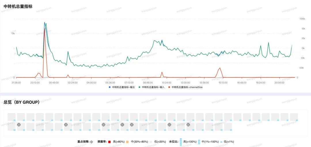 首先是采集全链路各组件的运行状态,主要包括为每一类组件定义出标准化的metrics,并结合实际运维过程中遇到的问题,定义出丰富的异常码以辅助问题快速定位,基于这些数据或事件,可以构建独立的系统监控闭环: 不仅可以实时观测各个节点上各个组件的运行状态,比如采集Agent是否存活、是否存在阻塞、是否存在采集异常以及存在哪种异常等等。 也可以从全链路的视角来实现异常的自主发现,比如通过Agent上报的文件校验信息与实际采集的日志信息可以判断采集延迟、当前采集进度以及判断当前日志是否存在丢失等。 其次是数据路由网关化,前文提到,我们在架构中引入了数据路由(即中转机),借鉴API网关的设计理念,通过管道将服务器的资源网格化,通过平台控制面规则配置可灵活控制资源隔离的粒度,通过监控管道的流量实现对全局水位的监控和预警。
