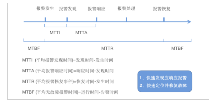 报警管理的根本目标是降低MTTA、缩短MTTR、提升MTBF,即快速发现并响应报警,快速定位并修复故障。