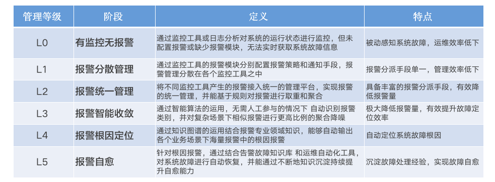 L5以及之上的报警预防,则聚焦于故障发生后的无感知自愈,甚至通过报警预测联动知识图谱及自动化运维平台能力将报警消灭在萌芽状态,是我们报警管理的终极目标。