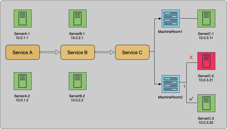 用A、B和C这三个业务模块来说明上述问题:这三个模块的调用关系为A调用B,B调用C,C根据机房划分为C1和C2两个子模块。A模块下有2台机器(10.0.1.1和10.0.1.2),B下有2台机器(10.0.2.1、10.0.2.2),C1下有1台机器(10.0.3.11),C2下有2台机器(10.0.3.21和10.0.3.22)。