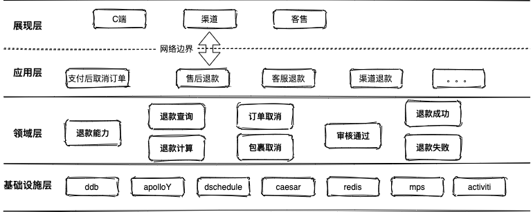 建模阶段通过事件风暴完成设计从0到1:召集业务团队、产品团队、技术团队对领域信息和领域边界达成一致,统一语言,输出领域模型,通过抽象、封装和多态等设计要素,提升代码的复用程度,降低系统的业务复杂度。 确定“退款能力”、“退款查询”、“退款计算”、“订单取消”和“包裹取消”等领域能力; 构建“审核通过”、“退款成功”和“退款失败”等领域事件。