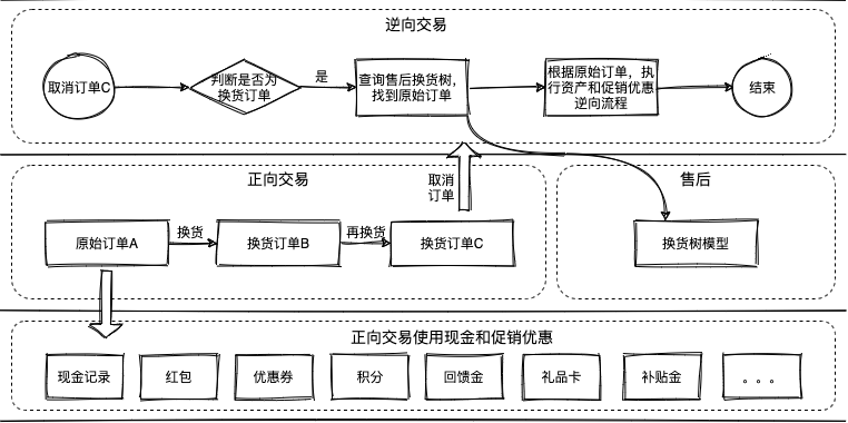 换货订单:只有原始订单关联资现金和促销优惠,针对换货后订单发起逆向流程,需要定位到原始订单,然后对原始订单使用的现金和促销优惠执行逆向操作。
