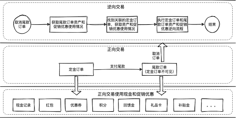 定金购订单:定金订单和尾款订单都会使用现金和促销优惠,针对尾款订单发起逆向流程(比如:取消订单),需要对定金订单和尾款订单使用的现金和促销优惠都执行逆向操作,涉及多笔支付订单。