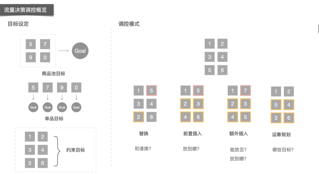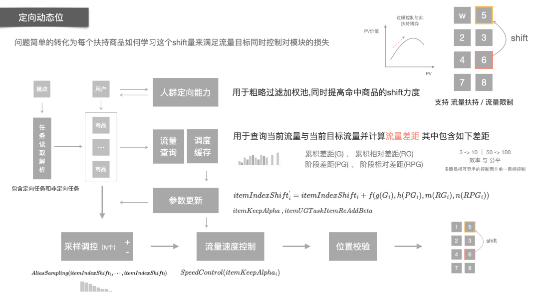 动态位模式:关注耐力和节奏把握 接下来说一说动态位模式,这个模式没有插入,可以认为是纯粹的重排,关键是基于实时的反馈去学习每个商品对应的位移大小。和固定位不同,在这个模式下我们复用了上游的模型排序,只不过使用的是绝对的排序位置而非实际得分,出于两点考虑,一是多模块的复用性,二是调控的稳定性。其次同上我们会计算商品的实际流量和目标流量的差异,分别获取累积差距、累积相对差距、阶段差距、阶段相对差距等误差项来计算当前位移更新量。此处的误差计算和固定位任务类似,可以做统一,因此在工程实现上将两种task汇总后统一调度实时查询接口做计算以提升性能,只不过参数更新逻辑上会有差异。为了控制调控的力度,每次请求会对重叠的商品集合依据调控位移值做概率分布的转化,然后采样出N个商品做位移调整,最后再加一层调控密度分布的位置校验。 业务中,潜力品等商品则采用动态位的方式,这种方式能干预的范围相对更大,但是力度上会弱一些,是一个涓涓细流持续扶持的过程,商品们在这过程中不断得优胜劣汰,像一个长跑选手,关注耐力和节奏把握。