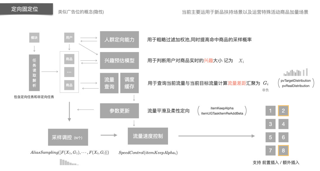 固定位模式:关注短期爆发 对于固定位模式我们可以将其理解为一种柔性资源位的概念,在产品形态没有变化的情况下,算法先行可以迅速在多模块类似资源位的模式给目标商品提供流量,这种流量供给模式有资源位的优势,比如流量供给比较迅速和直接,也有其自身的优势比如各商品的目标流量满足后会自动释放占用的位置,其次能够将定向能力、预估模型等能力迅速扩展到各个推荐和搜索场景。具体的流程可以简单概括为:对每一次请求,对扶持池商品基于模块信息、人群定向、当前时刻的流量需求以及PV价值预估进行过滤和排序,然后基于概率采样来获取我们本次需要调控的商品,将这些商品在固定位进行曝光。在此需要说明下,对于某些模块,我们会开启插入模式,即使商品在召回链路没召回也会做曝光,可以认为扩展了召回的渠道,而对于大部分模块我们只干预有召回的商品,可以认为是一种重排。 当前时刻的流量需求可以展开稍微谈一谈,因为这个子场景也是一个公平和效率的典型例子。比如A商品的总需求是5,当前已满足需求是2;B商品的总需求是100,当前已满足需求是60;C商品的总需求是20,当前已满足需求是8,流量的扶持是流模式提供的,那么如何评估他们当前相对的需求大小呢?按照绝对量来看B商品需要40大于A商品3的需求,按照相对量来看,A商品还有60%的相对差距大于B商品的40%的相对差距。如果按照绝对量优先,那么类似A的商品流量很难被满足或者很长一段时间都轮不到它,如果按照相对量优先A和B当前的优先级看似合理了但是A和C如何排序呢?因此我们设计了兼顾绝对量和相对量以及阶段误差和累积误差的需求评定算法,有点像PID的控制逻辑,只不过我们面临的是多商品相互竞争的控制而非单一目标控制。通过这个控制来让流量分配在品间轮流,使得流量供给在时间维度平滑的基础上加了品间的平滑。类似的问题还有一个叫做最大最小公平分配算法,和我们的场景略有差异但是有兴趣的也可以看看。如果对商品再加一些其他的指标约束,问题会进一步复杂也更接近现实,这是个有意思的方向。 业务中,比如新品和趋势品采用的是固定位的方式,这些品需要更直接的流量供给以及短期快速的流量提供,像一个短跑选手,关注短期爆发。