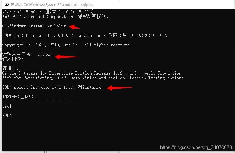 根据提示输入用户名system和相应口令(不能输入用户名scott,查不到)