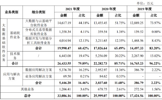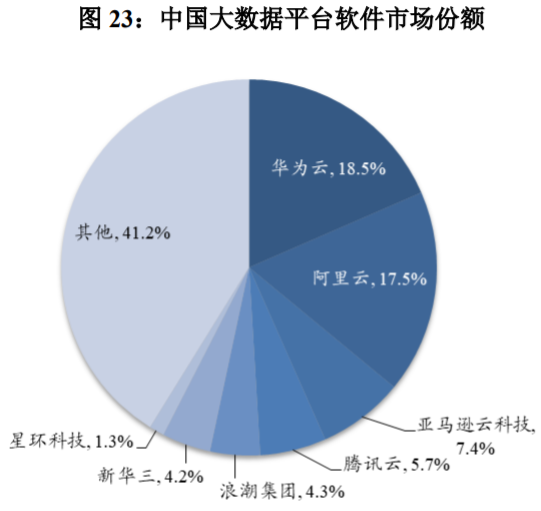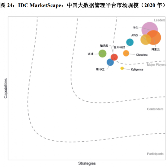 公司是一家企业级大数据基础软件开发商,围绕数据的集成、存储、治理、建模、 分析、挖掘和流通等数据全生命周期提供基础软件及服务,已形成大数据与云基础平台、 分布式关系型数据库、数据开发与智能分析工具的软件产品矩阵,支撑客户及合作伙伴 开发数据应用系统和业务应用系统,助力客户实现数字化转型。随着硬件成本的 下降以及软件附加值的提升,预计未来全球大数据市场中硬件及服务收入贡献占比将逐 渐减少,软件将超过服务和硬件,成为全球大数据市场最主要的收入来源。根据 IDC 报告,2021 年上半年,公司在中国大数据平台软件的市场份额排名第七。各 厂商的市场占有率如下:公司综合能力较强,2020 年 10 月,IDC 发布《MarketScape:中国大数据管理平台 厂商评估,2020》,公司综合能力排名市场第四,是中国大数据管理平台市场的领导者。 该综合能力指通过关键战略(包含增长、研发速度、生产效率等)、关键能力维度评价 (服务范围、客户服务交付等)对中国大数据管理平台厂商综合能力排名。在国内,大数据市场主要参与者包括公有云厂商、ICT 厂商以及专业软件公司,其 中以华为云和阿里云代表的国内云厂商,基于自身在公有云环境下的优势,分别推出了 各自的大数据基础软件产品,公有云也是该类厂商提供大数据产品的主要方式;伴随近 年来大数据市场的快速发展,以新华三为代表的部分 ICT 厂商,也布局了相关大数据 软件产品;随着大数据技术的快速发展,以星环科技为代表的专业软件公司更加专注于 大数据领域,在大数据基础软件领域开展研发并推出了迎合中国市场需求的产品,获得 了相应的市场份额。
