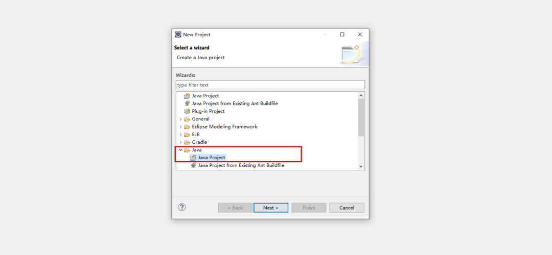 之后会弹出选择向导,找到 java ,选择 Java Project,完成后选择 Next。