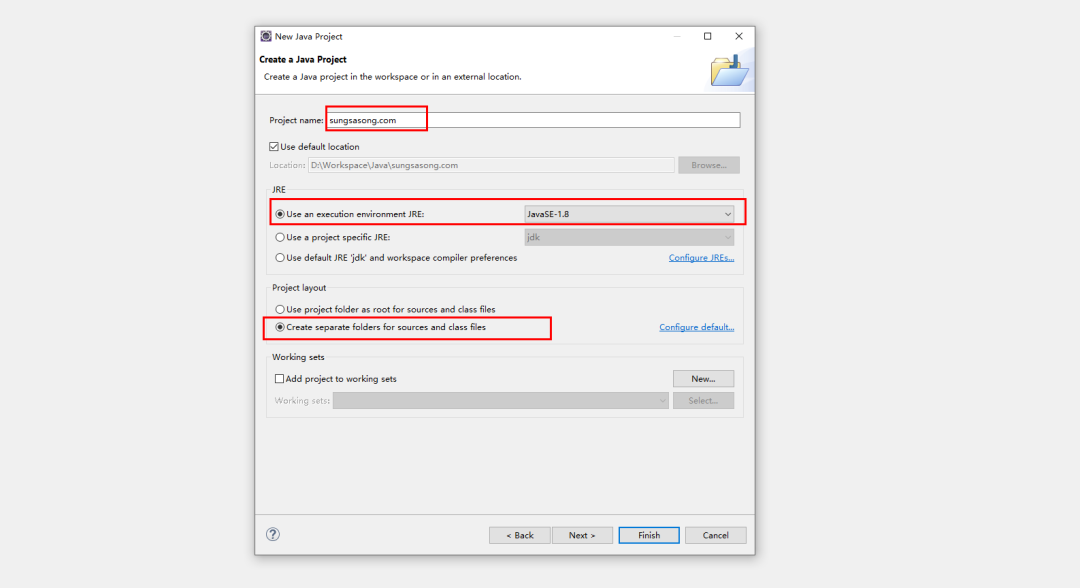 点击 Next 后,会弹出创建 java 工程向导,自己命名一个 project name,此处示例命名为 sungsasong.com,JRE 默认使用 JavaSE-1.8,Project layout 默认将源代码和 class 文件分离。
