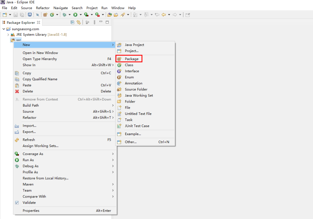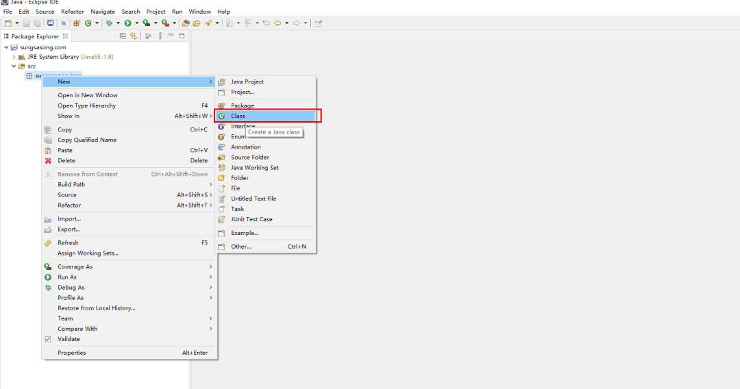 在完成 java project 创建后,在左侧栏中,点开 sungsasong.com 工程,