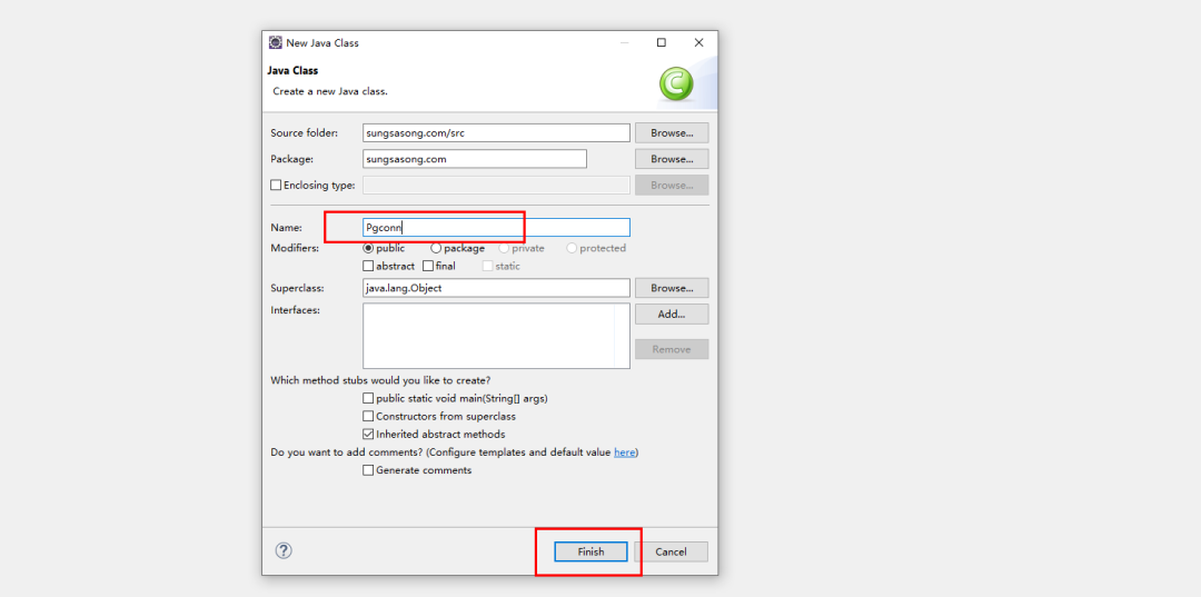 然后再弹出的界面命名一个 Java Class Name,此处命名为 Pgconn,点击Finsh 即可。