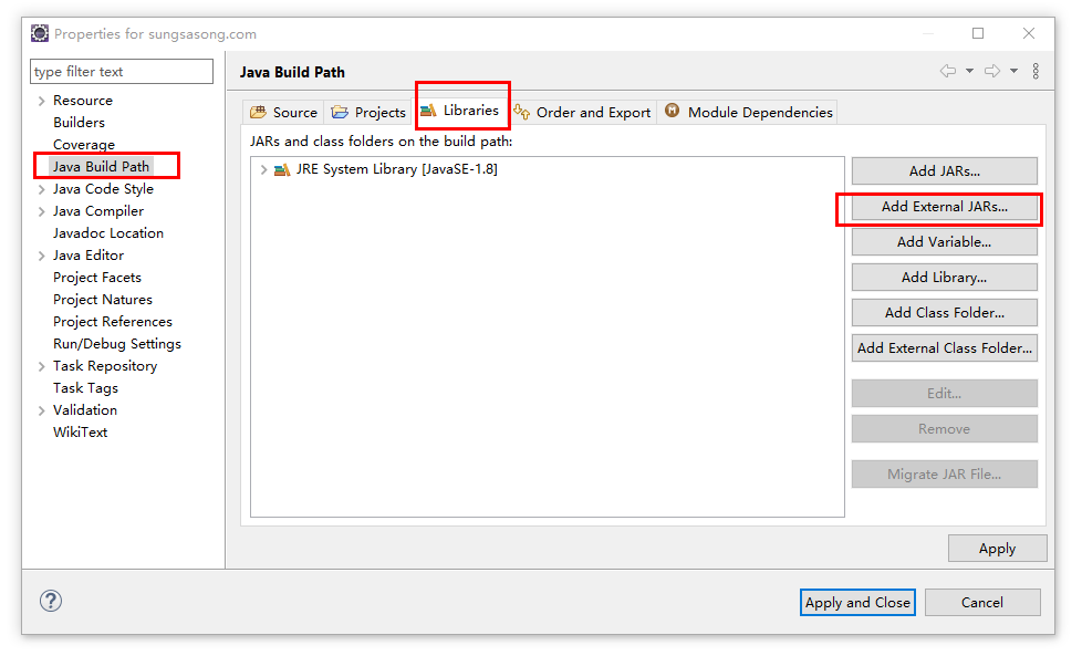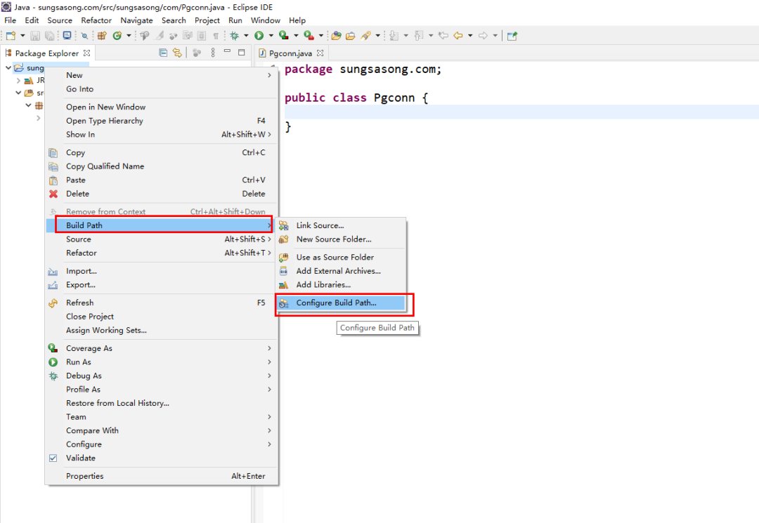 在Eclipse 左侧栏选中 java project sungsasong.com ,右键将会弹出如下图示,选择 Build Path——> Configure Build Path