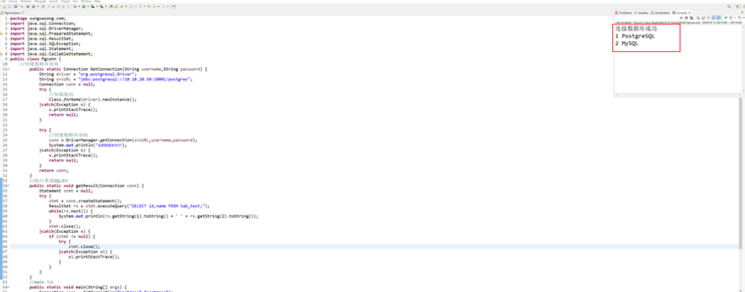package sungsasong.com;import java.sql.Connection;import java.sql.DriverManager;import java.sql.PreparedStatement;import java.sql.ResultSet;import java.sql.SQLException;import java.sql.Statement;import java.sql.CallableStatement;public class Pgconn {//创建数据库连接public static Connection GetConnection(String username,String password) {String driver = "org.postgresql.Driver";String srcURL = "jdbc:postgresql://10.10.20.50:10001/postgres";Connection conn = null;try {//加载驱动Class.forName(driver).newInstance();}catch(Exception e) {e.printStackTrace();return null;}try {//创建数据库连接conn = DriverManager.getConnection(srcURL,username,password);System.out.println("连接数据库成功");}catch(Exception e) {e.printStackTrace();return null;}return conn;}//执行普通SQL语句public static void getResult(Connection conn) {Statement stmt = null;try {stmt = conn.createStatement();ResultSet rs = stmt.executeQuery("SELECT id,name FROM tab_test;");while(rs.next()) {System.out.println(rs.getString(1).toString() + ' ' + rs.getString(2).toString());}stmt.close();}catch(Exception e) {if (stmt != null) {try {stmt.close();}catch(Exception e1) {e1.printStackTrace();}}}}//main 方法public static void main(String[] args) {Connection conn = GetConnection("postgres","postgres");getResult(conn);try {conn.close();}catch(SQLException e) {e.printStackTrace();}}}
