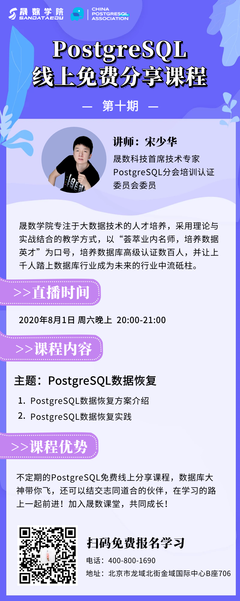 PostgreSQL线上免费直播课程分享第十期,本期主讲内容:PostgreSQL数据恢复,上课方式:腾讯课堂,上课时间在8月1日周六晚上20:00-21:00,咨询问题请扫描下方二维码,欢迎大家参加~