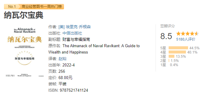 对比之后,可见一斑。多方评价看,《纳瓦尔宝典》的确是一本好书。