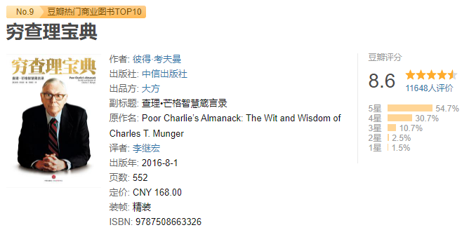 《纳瓦尔宝典》豆瓣 5180 人评价,评分8.5分。另外一本查理·芒格的商界畅销书《穷查理宝典》豆瓣共 11648 人(出版于6年前),评分8.6分。